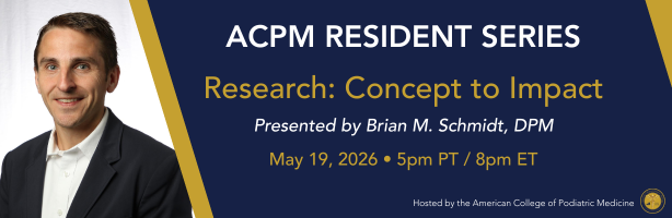ACPM invites you to a lecture by Brian Schmidt, DPM, on "Research: Concept to Impact." This is a practical, clinician‑focused guide to transforming meaningful clinical questions into high‑impact research. Using real-world examples from diabetic foot care, this talk highlights clear methods, clinically relevant statistics, and effective publishing strategies to help clinicians turn ideas into impactful scholarship.